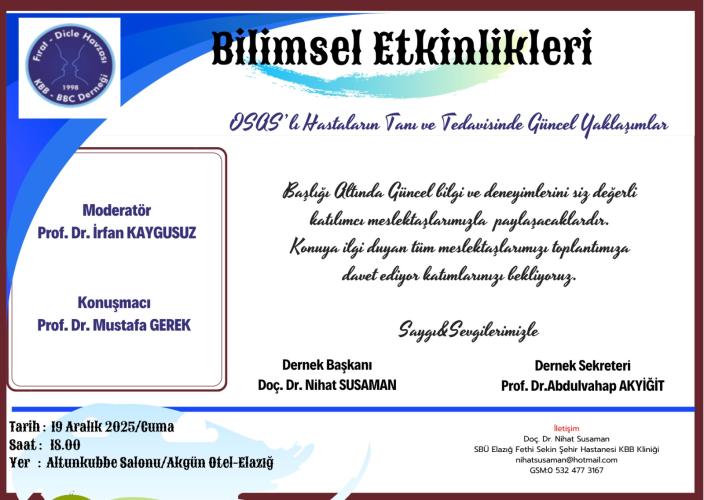 Sayın Prof.Dr.Mustafa Gerek OSAS’ lı Hastaların Tanı ve Tedavisinde Güncel Yaklaşımlar başlığı altında bilgi ve deneyimlerini siz değerli katılımcı meslektaşlarımızla tüm meslektaşlarımızı toplantımıza davet ediyor katımlarınızı bekliyoruz.